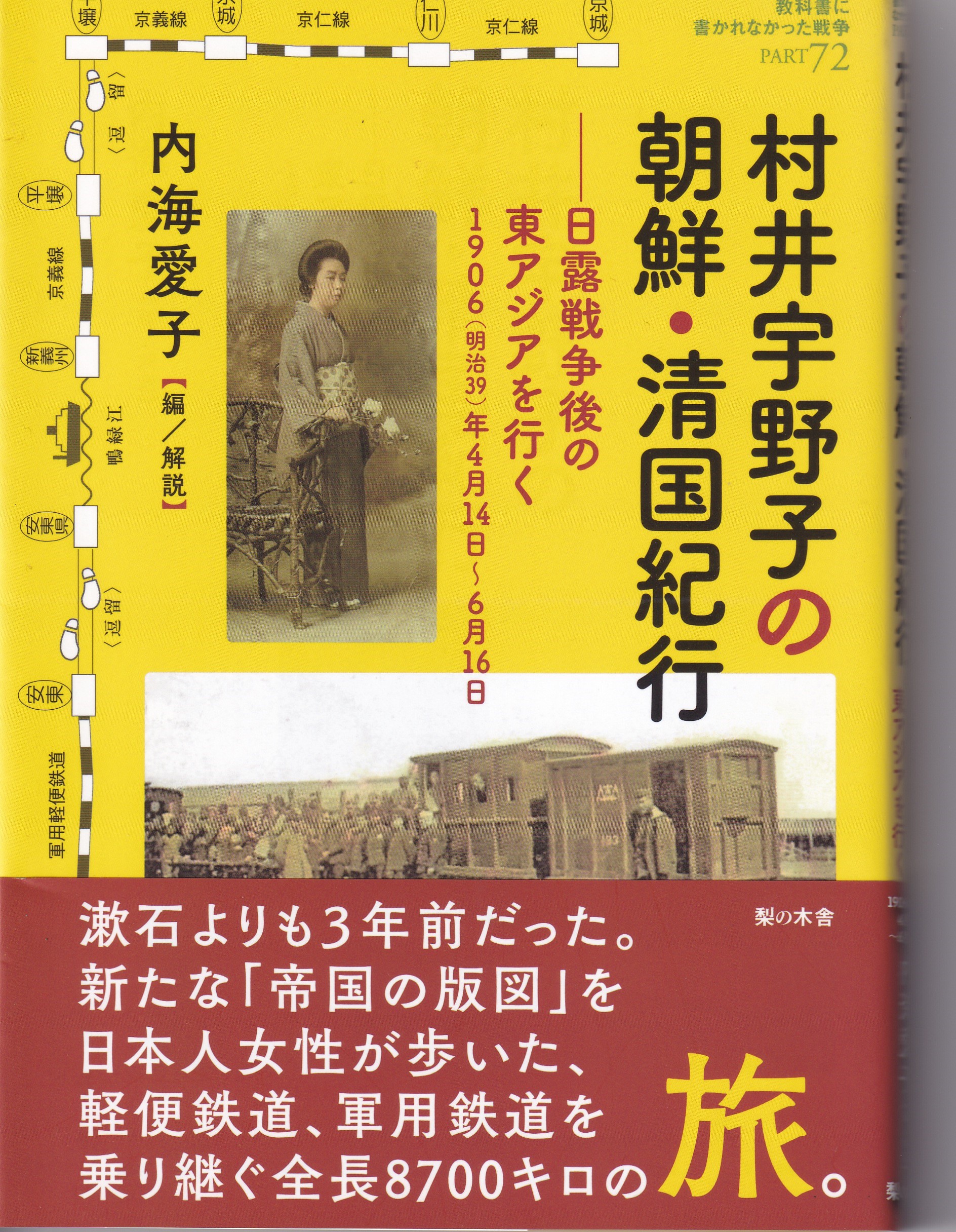 『村井宇野子の朝鮮・清国紀行—-日露戦争後の東アジアを行く:1906(明治39)年4月14日~6月16日』 梨の木舎/2021年/1800円+税/ISBN:978-4-8166-2106-2 漱石よりも3年前、新たな「帝国の版図」を日本人女性が歩いた、軽便鉄道、軍用鉄道を乗り継ぐ全長8700キロの旅。