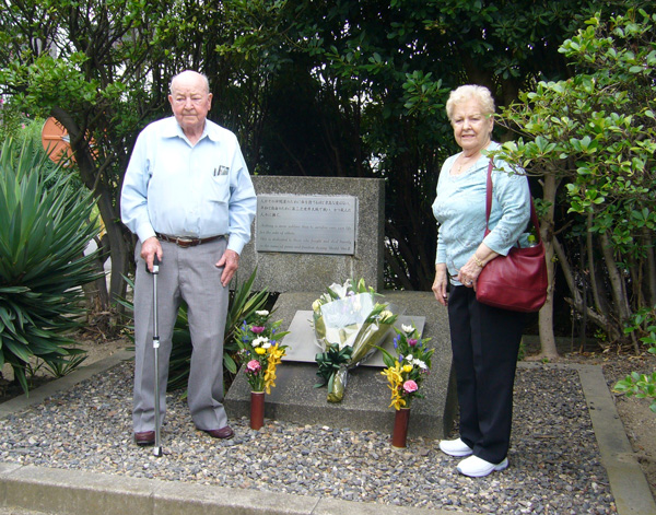 The Szwabos placed bouquets before the memorial monument for the deceased POWs in the grounds of Ishihara Sangyo Yokkaichi factory. |