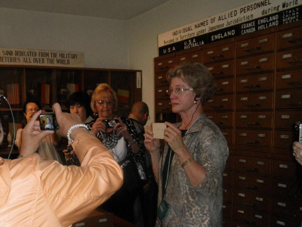 In Moji, they met with Ms. N (89 years old), who lived next door to the POW camp (Fukuoka No. 4 Branch camp). The YMCA building was used as a POW camp. Since Ms. N's father owned and operated a dock-yard, he had some POWs work at the dock-yard, and she used to watch POWs march in file to work. When Ms. Thompson said according to her father, after he regained his health, he carried bodies of his deceased colleagues to a crematory. On his way back, an elderly couple gave him a double handful of onions. Ms. N mentioned that in those days, vegetables were hard to get in Japan. After the war was over, when the relief items were air-dropped over the camp, the POWs brought some of them to her house and said, "We are friends now." Ms. N got married during the war, and showed them a photo. She wore a traditional Japanese wedding kimono, but her husband wore a government issued familiar a men's civilian wartime uniform. After meeting with Ms. N, they visited the Moji harbor where many POWs had disembarked, and the Moji station, where their respective trips to various places in Japan by train had originated. On the following day, they joined the Versaws and visited Dazaifu-Temmangu shrine near Fukuoka.