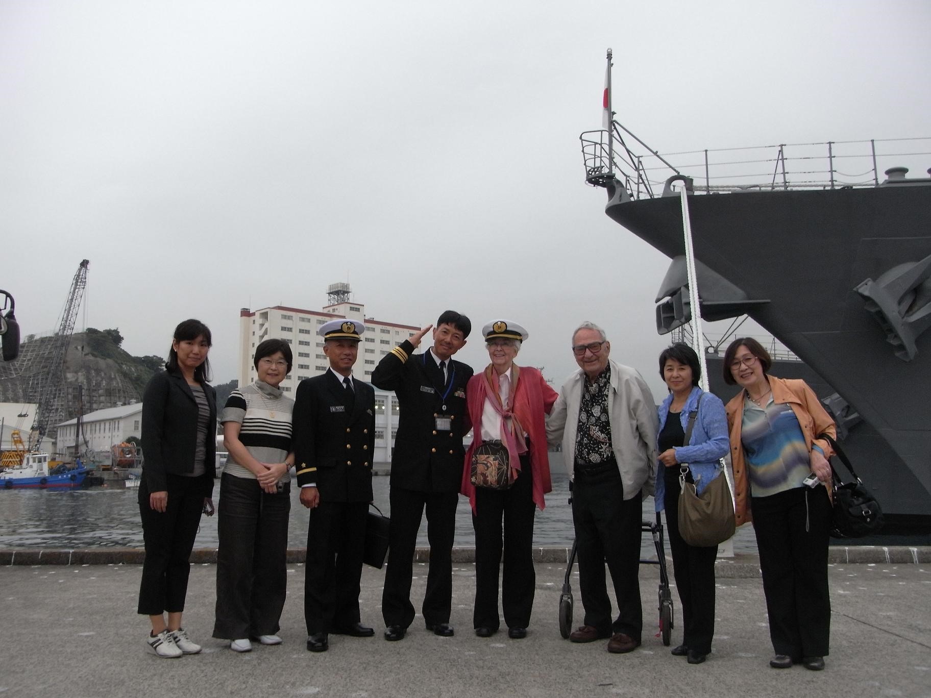 In the afternoon, the group went to the Yokosuka base of the Japan Maritime Self-Defense forces. A press officer started to explain the base by showing slides, but suddenly Mr. Edwards said, "This is the wrong place. I wanted to go to the US Naval base." So, plans were quickly rearranged and a staff from the Foreign Affairs took Mr. and Mrs. Edwards to the American base. Mr. and Mrs. Farquhar and four members of the POW Research Network stayed and were given a tour of the Maritime Self-Defense force base.