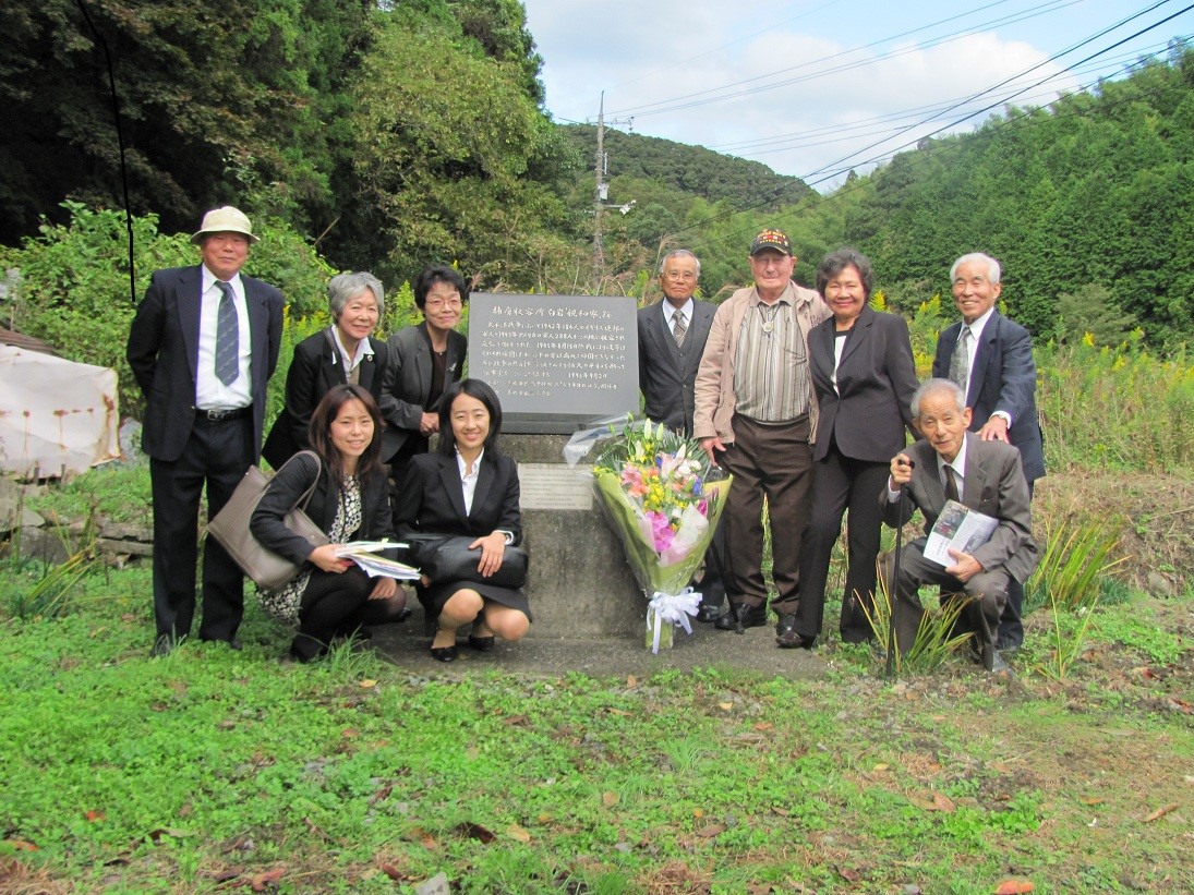On the 18th, after visiting with the Mayor of Mine, Mr. Koji Murata, they visited the entrance to Omine copper mines and site of the former camp under the guidance of Mr. Masami Hasama and Mr. Fumio Yamamoto who are members of a group called, "Itsuka no Kai" that records the war experiences of the local people. Along the way, children of a kindergarten that Mr. Hasama runs waved American and Japanese flags welcoming Mr and Mrs. Mims. At the site of the former camp there is a memorial stone that the "Itsuka no Kai" group erected. Mr. Mims laid flowers at the stone and related stories of when he was beat up injuring his neck and paralyzing his body.
