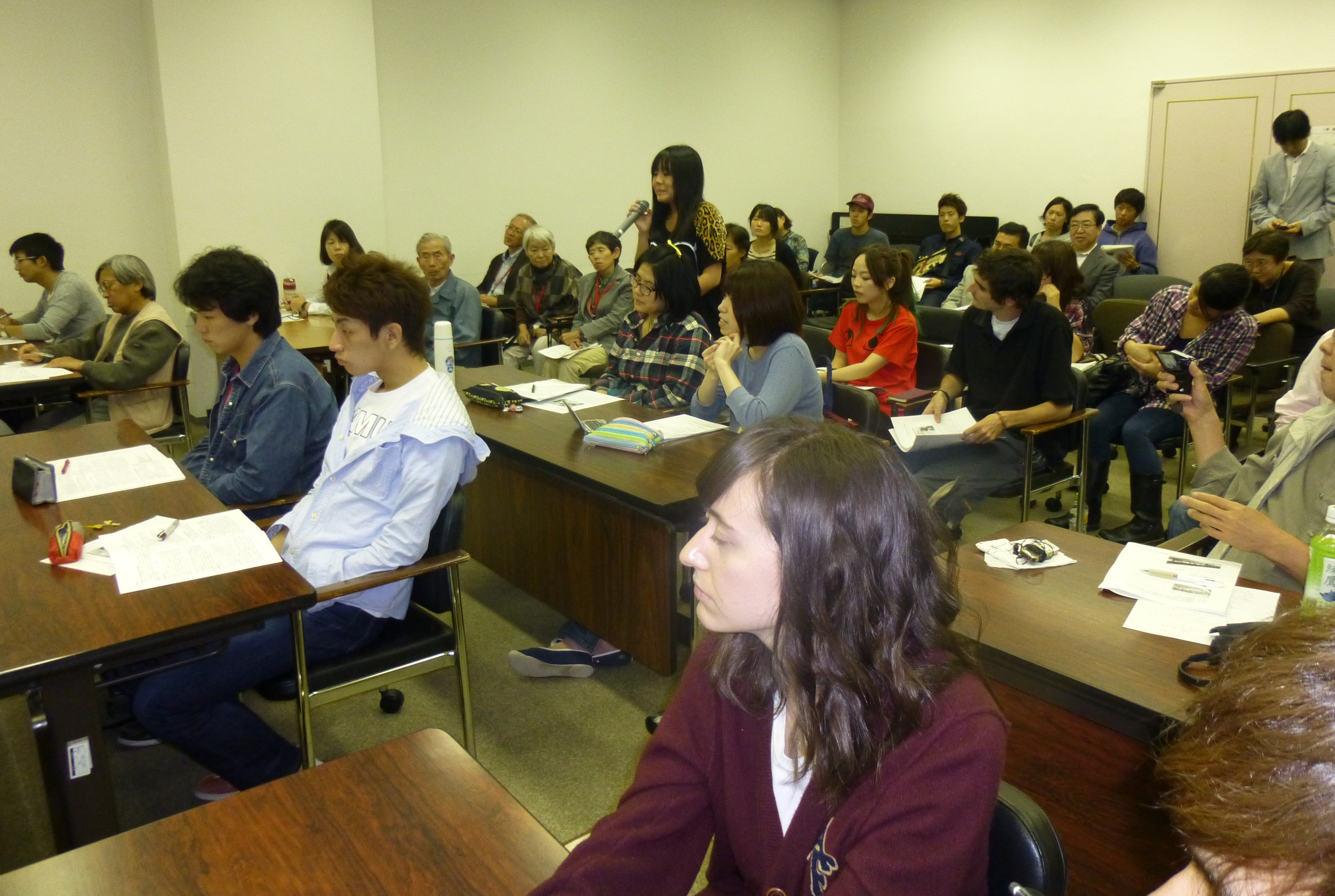 Here the group was greeted by many volunteers and museum staff and then escorted to the exhibition room for a tour of the museum. From 3pm, a public forum was held with about seventy people in attendance. This year thanks to the assistance from such groups as "Senso iseki ni heiwa wo manabu Kyoto no kai" and "Heiwa tomo no kai"and others, news about this forum was spread to students and faculty of Ritsumeikan University. As well, an article in the Kyoto Shinbum before had helped to attract people to attend.