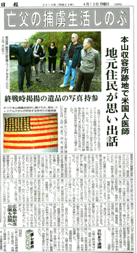 翌11日(日)は、まず新聞3社、テレビ局2社の取材を受けた後、収容所跡地を見学。今は何も残っていないが、当時収容所の近くで雑貨屋を営み、収容所に物資を納入していた人のお宅に、当時少年少女だった地元民6人が集まり、当時の思い出を語ってくれた。看守が見ていない隙に捕虜にタバコを差し入れてあげたとか、終戦後投下された救援物資のチョコレートやガムをもらったとか、生鮮食料品と物々交換をしたなどのエピソードを聞いて、ウィリアムズ氏は「当時少年少女だった皆さんとこうして一緒に現地に立ち、当時の記憶を分かち合うのは感極まるものがある」と涙を浮かべていたという。父上の遺品の中にパラシュート生地で作った星条旗があるので、一層このエピソードが印象深かったに違いない。
