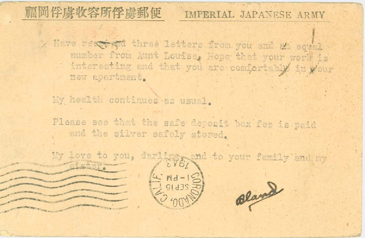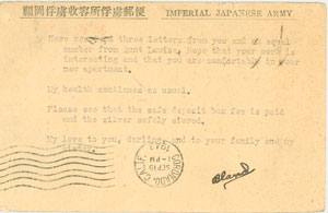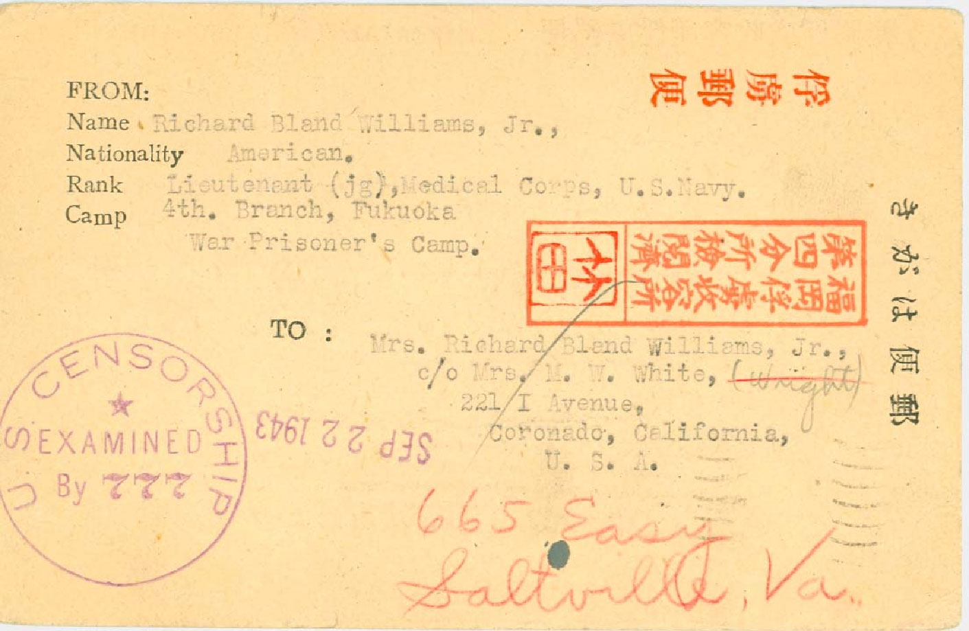門司収容所(福岡第4分所)のウィリアムズ軍医から故郷の両親宛の俘虜郵便。 |