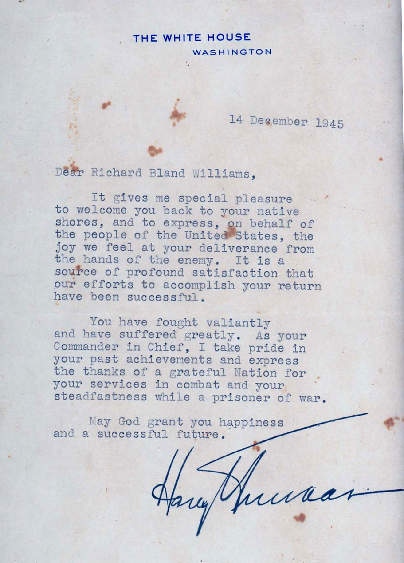 トルーマン大統領からウィリアムズ軍医への帰還祝いの手紙。 |