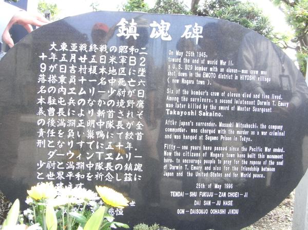 大橋住職はこの事件に心を痛め、1996年にエムリー中尉と満淵大尉を弔う鎮魂碑(日本文・英文)を建立し、毎年法要を営んだ。碑にはこう刻まれている——「大東亜戦争終戦の年、昭和20年5月25日、B29が日吉村榎本地区に墜落。搭乗員11名の内エムリー少尉(?)が日本駐屯兵のなかの境野鷹義曹長により斬首され、その後満淵中隊長が全責任を負い巣鴨にて絞首刑となり、すでに50年。ダーウィンTエムリー少尉(?)と満淵中隊長の鎮魂と世界平和を祈念し、茲に碑を建立す。平成8年5月25日 天台宗福壽山長栄寺第三十八世 権大僧正 大橋慈恒」。大橋住職は「釈尊は『人間はみな平等で尊い』と説かれた。釈尊の御心を心として、世界平和を実現すべきなのです」と語っていたという。大橋住職は何年か前に亡くなり、寺は今無人になっているが、鎮魂碑の前には美しい花が手向けられていた。